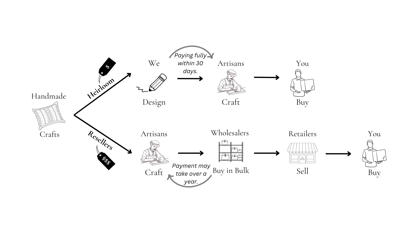 Les produits faits à la main prennent au moins quatre fois plus de temps que la production industrielle (par exemple, couvre-lits : 15 heures contre 4 heures), ce qui rend l'expansion difficile. Un paiement équitable est essentiel pour le temps et les efforts que les artisans investissent.
