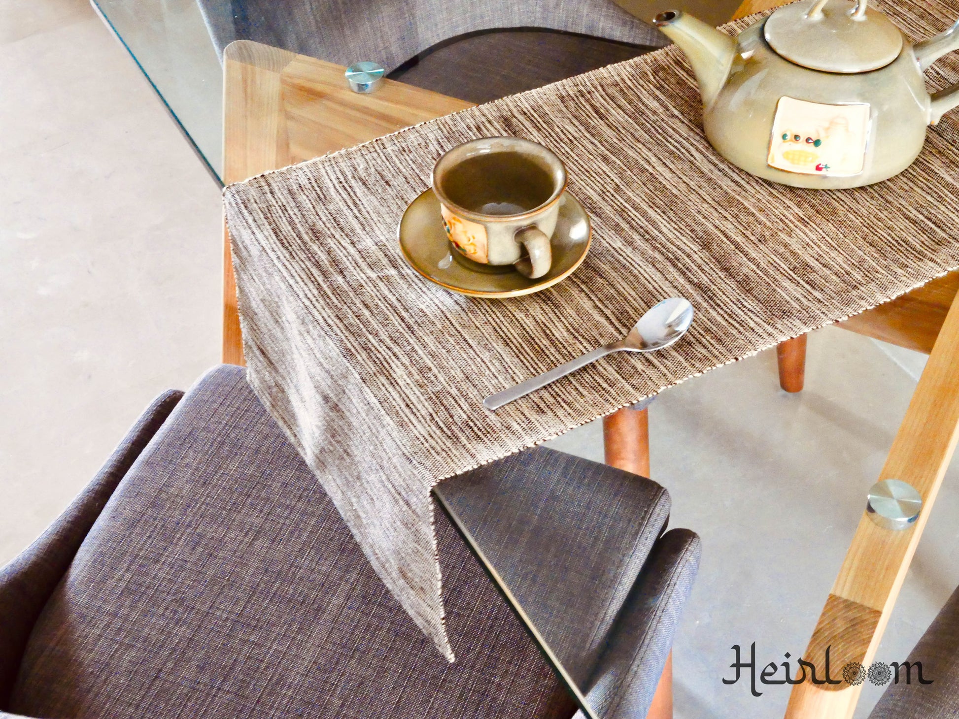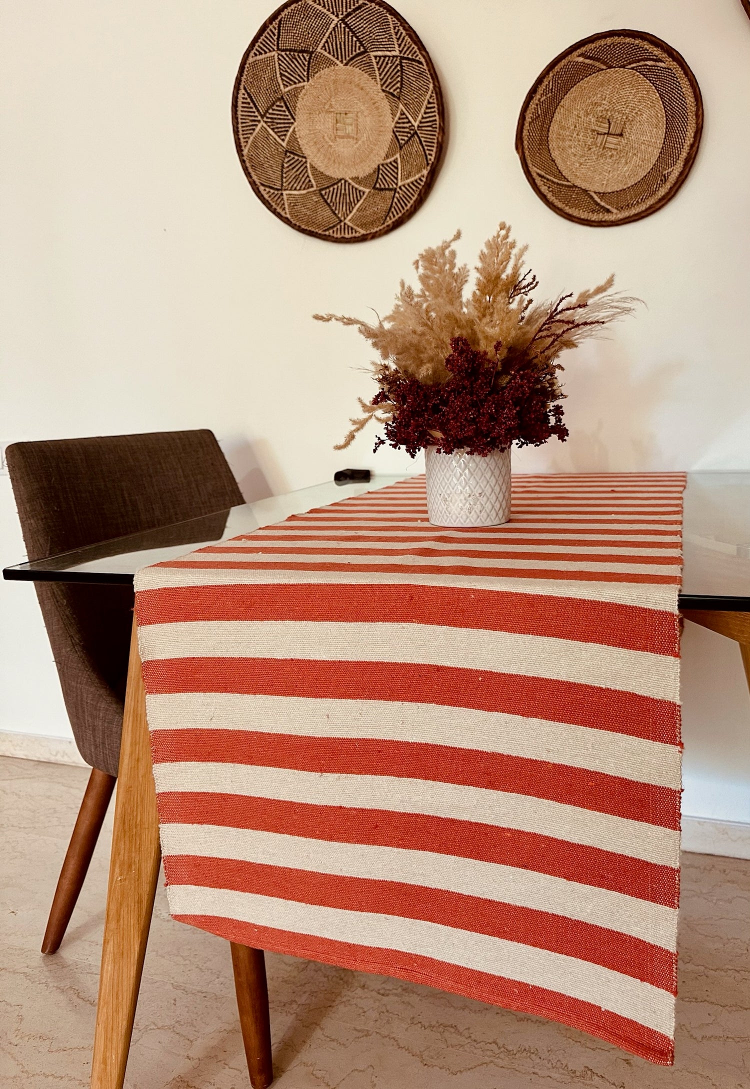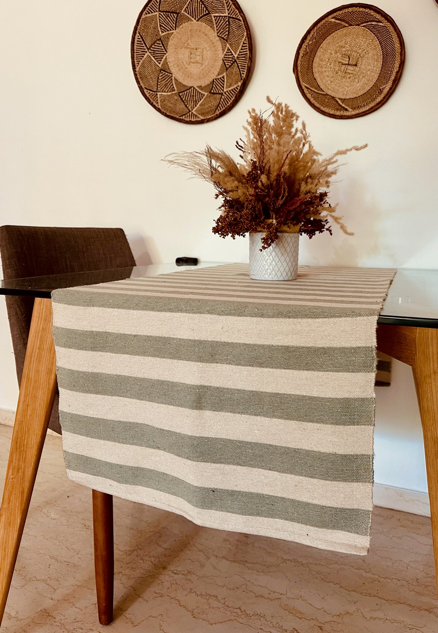 Rehaussez votre expérience culinaire avec notre chemin de table rayé fait main, inspiré de la beauté sereine des oliveraies.