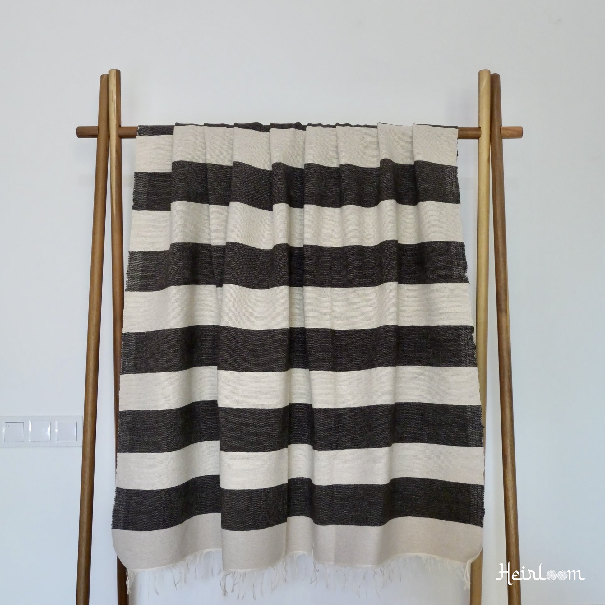 Il présente un motif rayé et minimaliste avec des franges décoratives aux bords, ajoutant une touche d'élégance et de texture à l'ensemble.