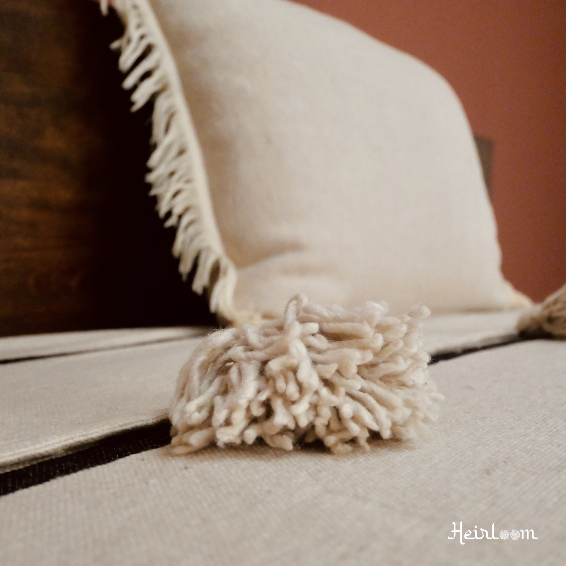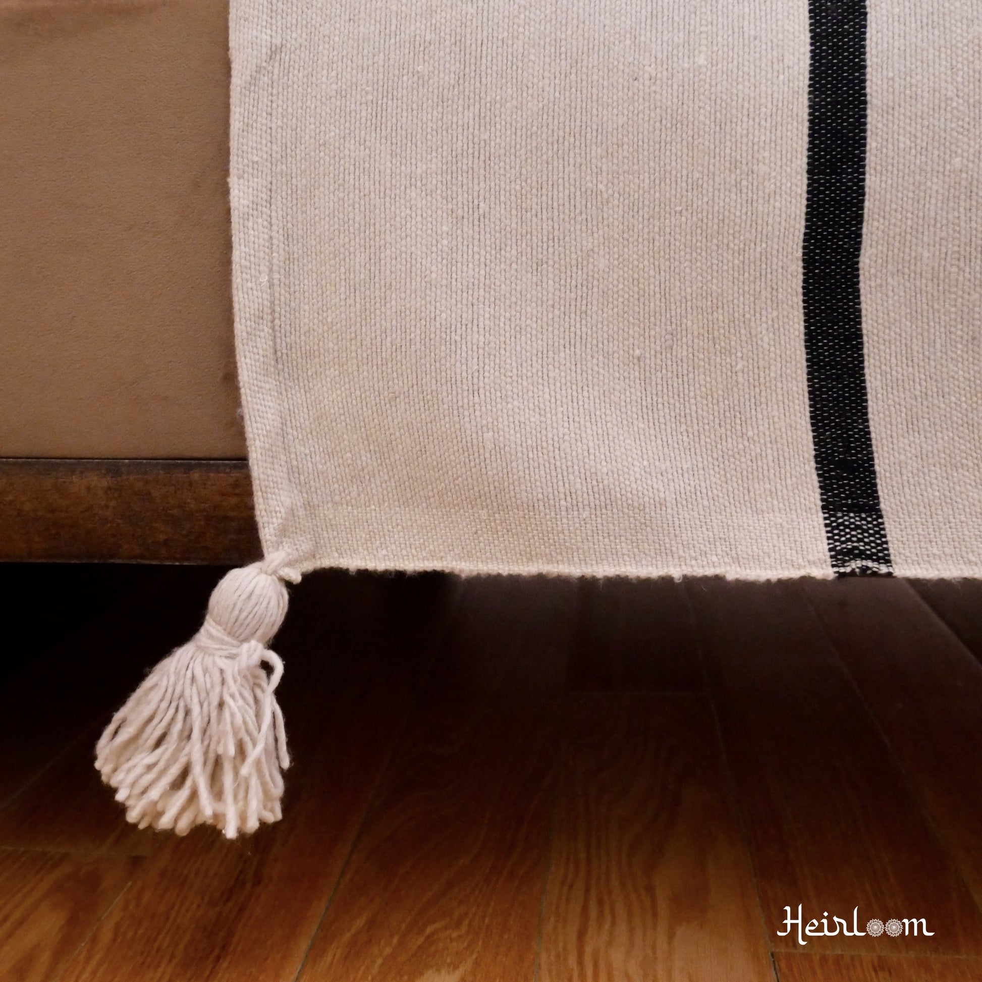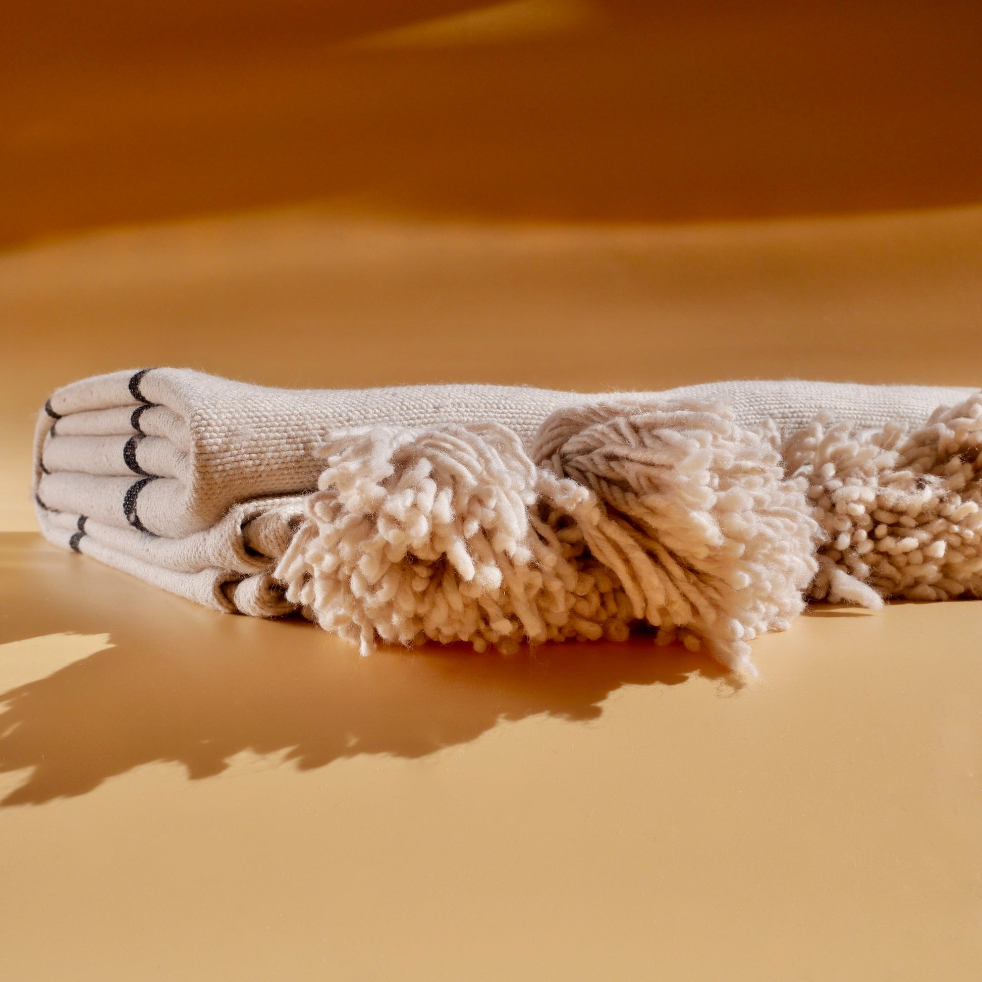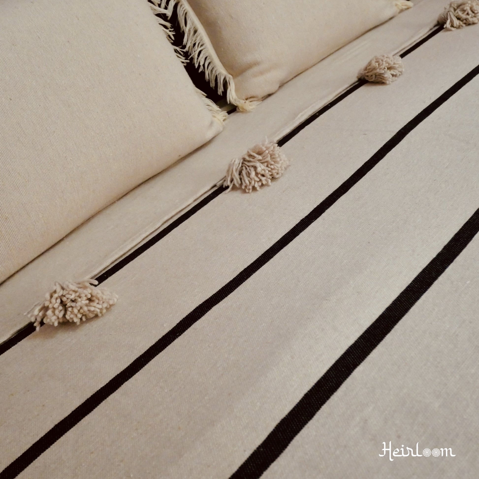 Elle présente un design simple et rayé, agrémenté de pompons attrayants, captant le regard de quiconque entre dans la pièce.