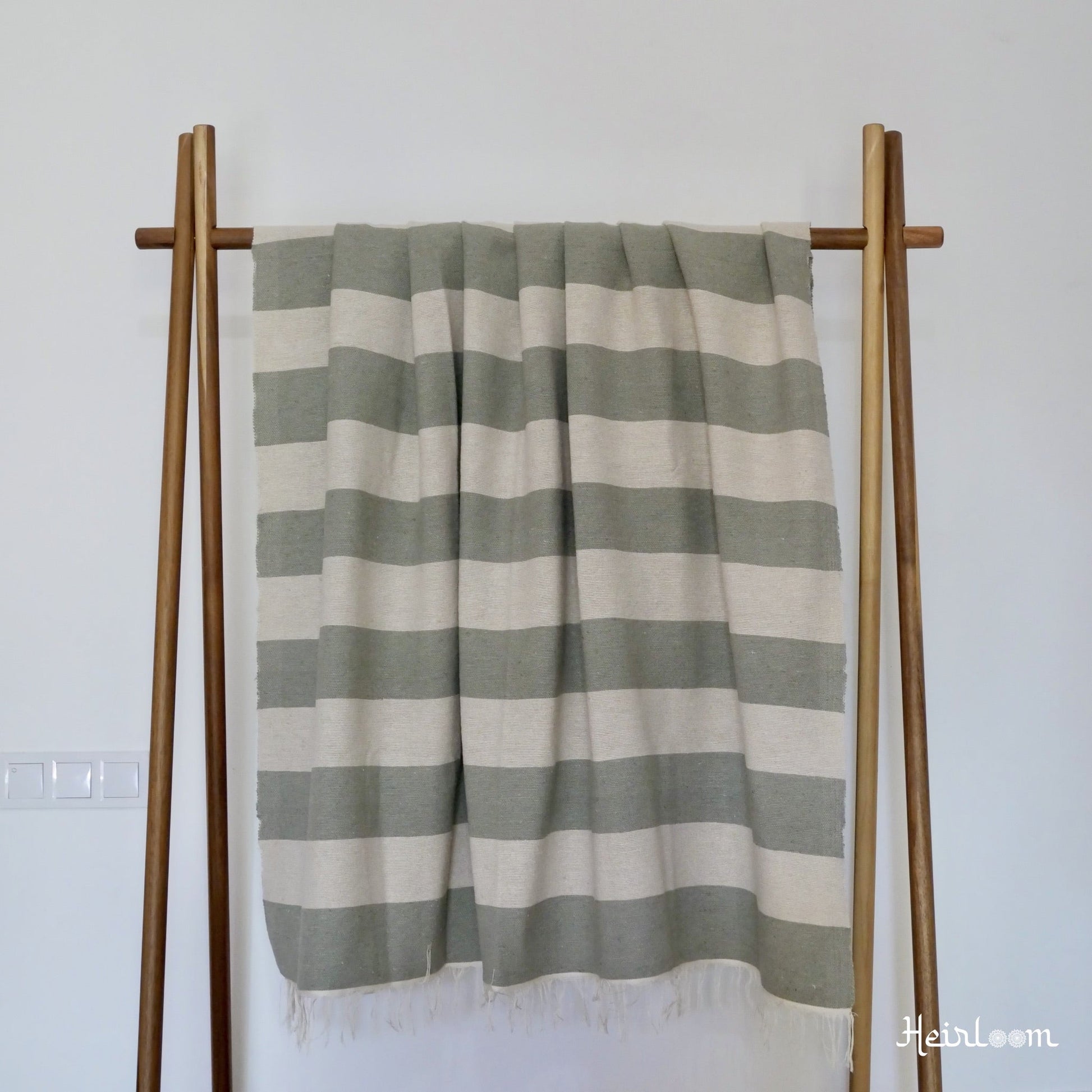 Il présente un motif rayé et minimaliste avec des franges décoratives aux bords, ajoutant une touche d'élégance et de texture à l'ensemble.